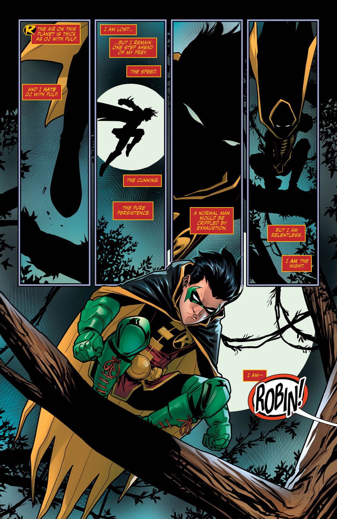 Il piccolo alieno, infatti, ruba il cibo ai due ragazzi e li conduce in una caccia attraverso la giungla, nella quale, presumibilmente, si troveranno faccia a faccia con l’uomo raffigurato sulla copertina dell’albo mentre minaccia Robin.
