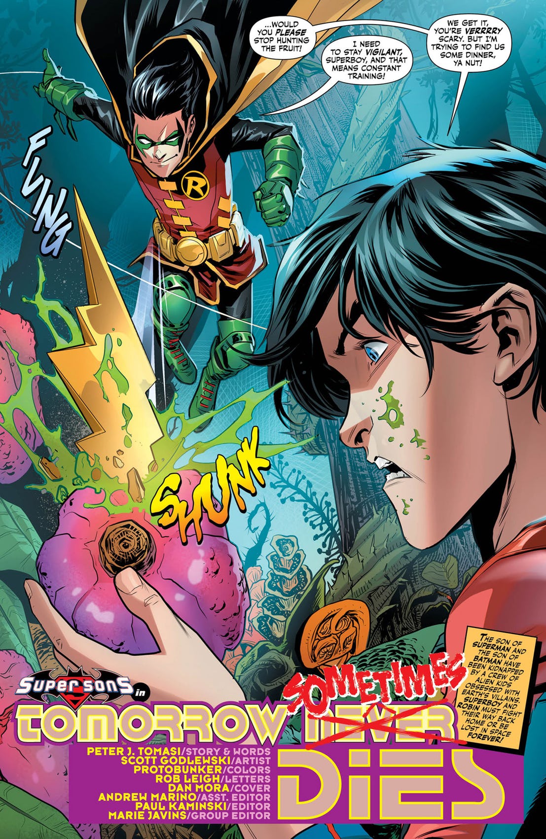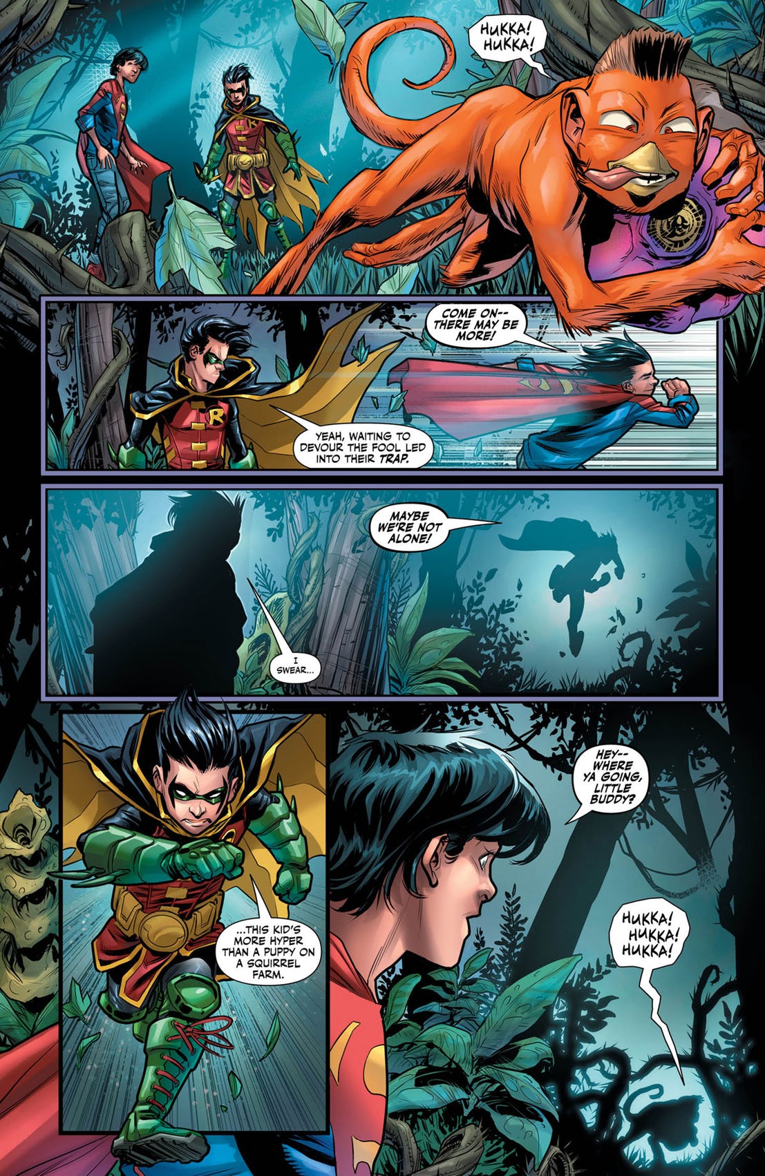 In un’anteprima diffusa dal sito CBR vediamo Superboy e Robin mentre si trovano in un pianeta alieno. Mentre i due giovani supereroi stanno raccogliendo della frutta, da un cespuglio compare Hukka, che agisce esattamente come i lettori che ne ricordano le avventure si aspetterebbero.