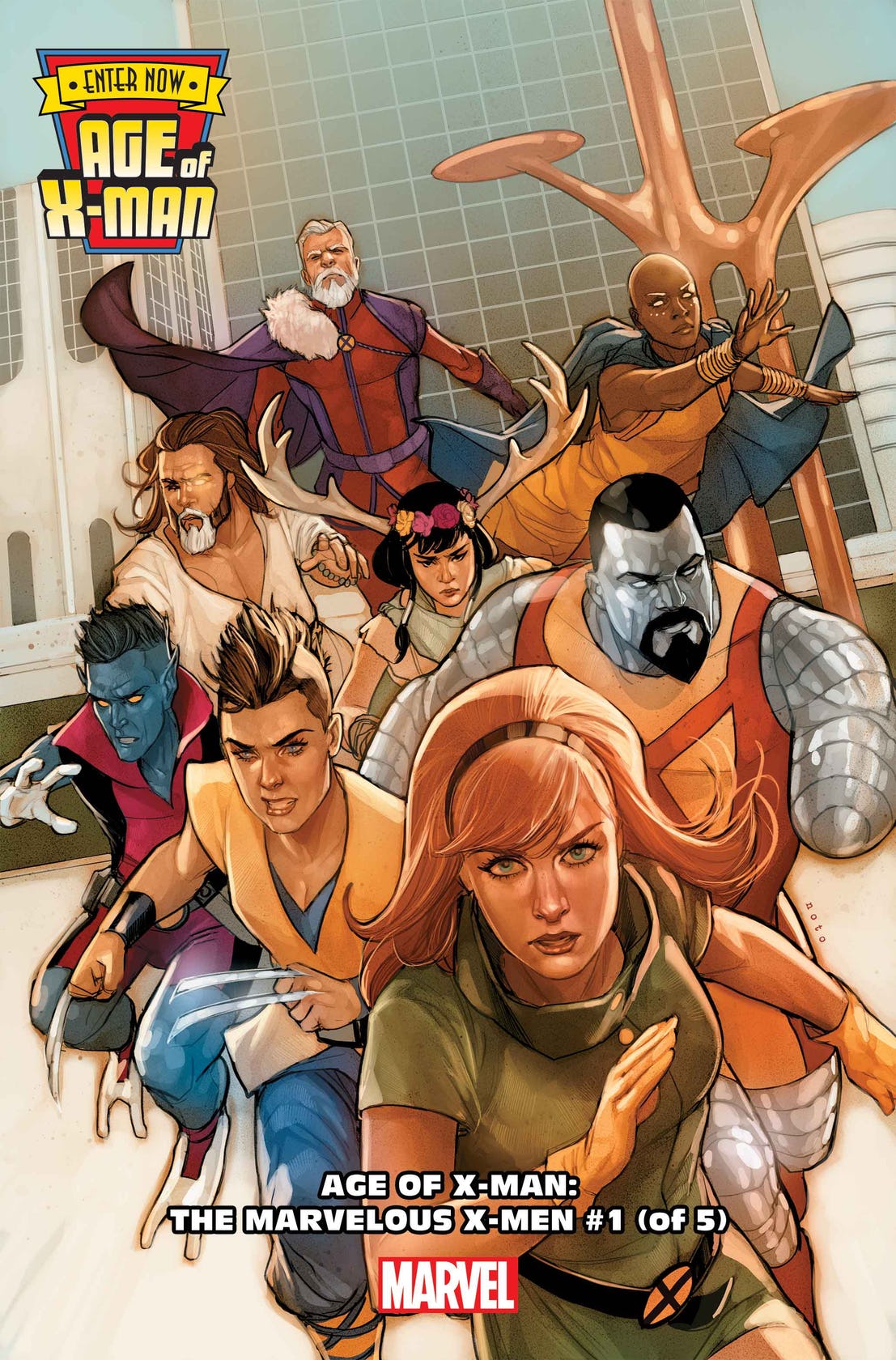 Nadler Il nucleo del nostro gruppo di X-Men è composto da X-Man, Jean Grey, Nightcrawler, Nature Girl, Magneto, Tempesta e Colosso. Li abbiamo scelti per una lunga lista di ragioni, ma principalmente perché erano quelli che aveva più senso trovare in un mondo pacifico, perché ognuno porta nella vicenda qualcosa di diverso e di molto personale. Non li troviamo in una realtà che impone battaglie frequenti, quindi il ruolo degli X-Men diventa quello di squadra di intervento per risolvere momenti di difficoltà o di emergenza, modello di etica e morale per tutta l’umanità.
