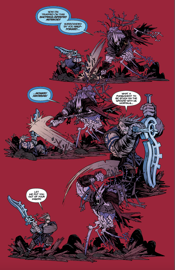 Ma è, appunto, soprattutto il racconto dell’incontro/scontro tra alcuni clan vichinghi e alcuni alieni precipitati nelle foreste scandinave. E saranno proprio alcuni di quei vichinghi a dover salvare il mondo dalle mire di un signore della guerra intergalattico che vuole assoggettare la razza umana e l’intero pianeta al suo dominio.
