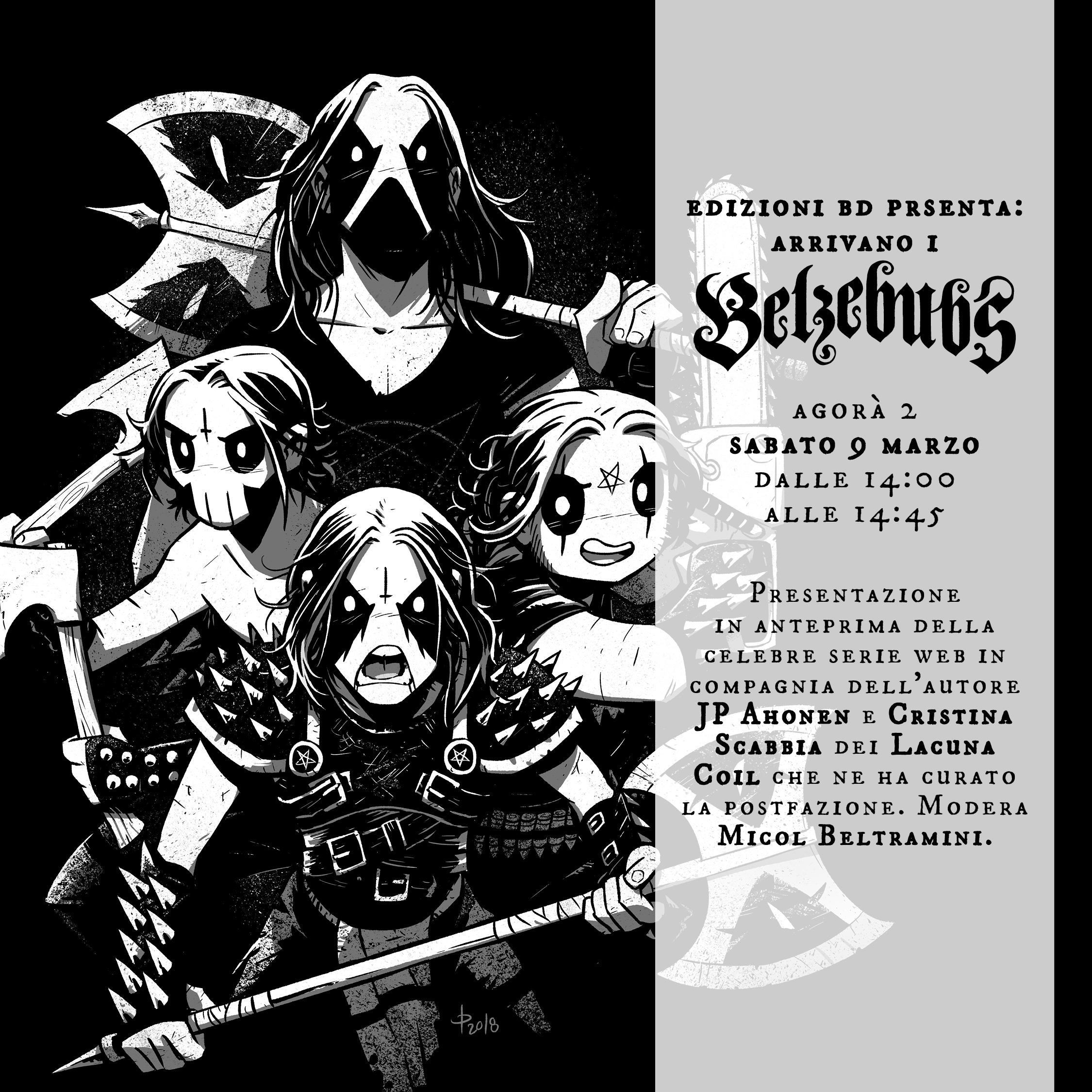 E sabato 10 marzo (14:00-14:45 – Agorà 2) Edizioni BD presenta: Arrivano i Belzebubs! Con l’autore JP Ahonen e Cristina Scabbia dei Lacuna Coil che ne ha curato la postfazione. Modera Micol Beltramini.
