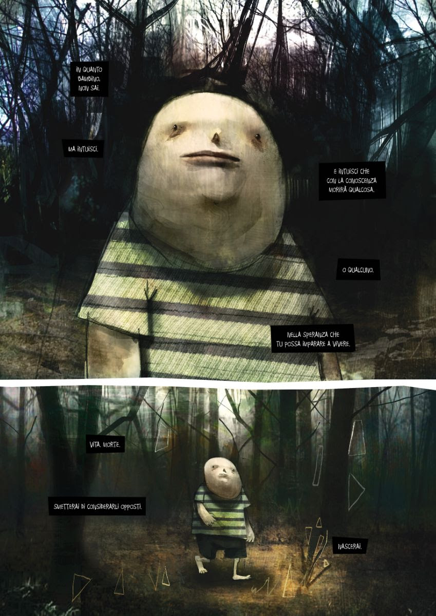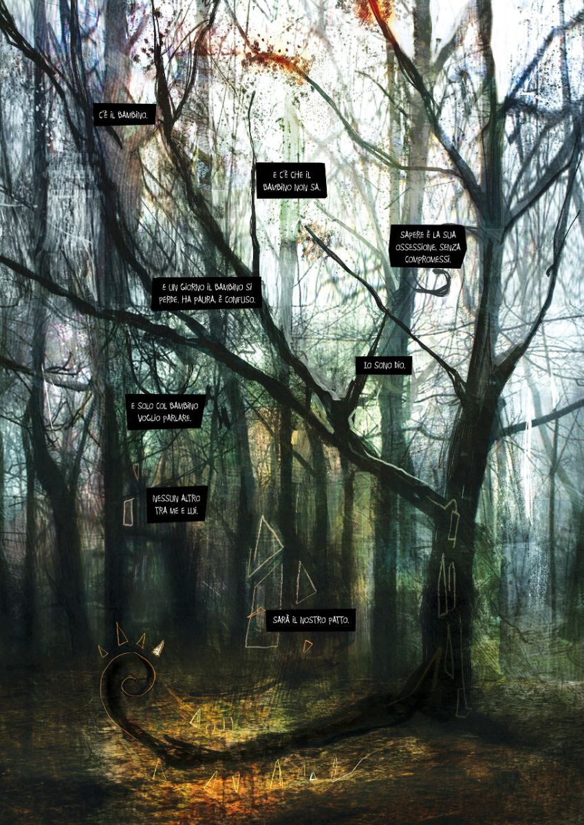 Ecco l’intensa dichiarazione dell’autore: “Succedono. La vita è fatta di accadimenti, una successione di eventi che si succedono. Alcuni straordinari, altri ordinari. Alcuni straordinari vissuti in modo ordinario e altri ordinari, vissuti in modo straordinario. Fatto sta che quest’estate è successo. Un accadimento forte, che mette un autore nelle condizioni ideali per lavorare ad una storia breve a fumetti. La storia da cui tutto inizia è Amor Condusse Noi, una storia necessaria per metabolizzare un accadimento. E più andavo avanti nelle tavole e nei testi, più non potevo fare a meno di citare Storielline, la mia prima autoproduzione del 2013. Senza volerlo, ne stavo scrivendo una sorta di seguito. Da lì è nata l’idea di Condusse Me. Un percorso durato sei anni, tra riflessioni e disegno, colore e pensieri. Tuttavia, anche se Storielline e Amor Condusse Noi si somigliavano, non potevano essere poste in consecutio. Mancavano degli elementi, a me chiari, ma sconosciuti al lettore che si sarebbe imbattuto in queste storie. È venuto in mio aiuto un bambino, curioso, solo. Un bambino che tutti noi conosciamo, che alberga dentro noi. Un bambino che decide di dedicare la sua esistenza alla conoscenza di se stesso, fino a sfiorare la sua stessa onnipotenza, diventando un dio. Il dio e l’uomo, come parti nemiche dentro noi stesse. La prima non accetta il tempo, l’altra impara a viverlo. Condusse Me parla di questo scontro che tutti viviamo. Ho messo me stesso in prima linea per portare avanti questo tema ma, pur non vedendoci, questo è un percorso che tutti facciamo, finché una delle due parti non prende il sopravvento.”