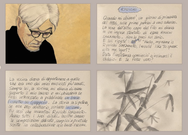 Attingendo ai propri taccuini di viaggio, riprodotti in formato originale, Kokoro racconta l’incontro di Igort con alcuni tra i più importanti esponenti della cultura giapponese del dopoguerra, da Ryuichi Sakamoto (premio Oscar per la colonna sonora de L’ultimo imperatoredi Bertolucci e protagonista della musica elettronica d’avanguardia, insieme a David Sylvian) a Katsuhiro Otomo (creatore di Akira, fumettista e regista pluripremiato), sino a Rumiko Takahashi (regina del manga, autrice di Ranma 1/2, Lamù, Maison Hikkoku, raccontata dal suo editor): uomini e donne di frontiera, capaci di parlare alla sensibilità dell’Oriente e dell’Occidente.