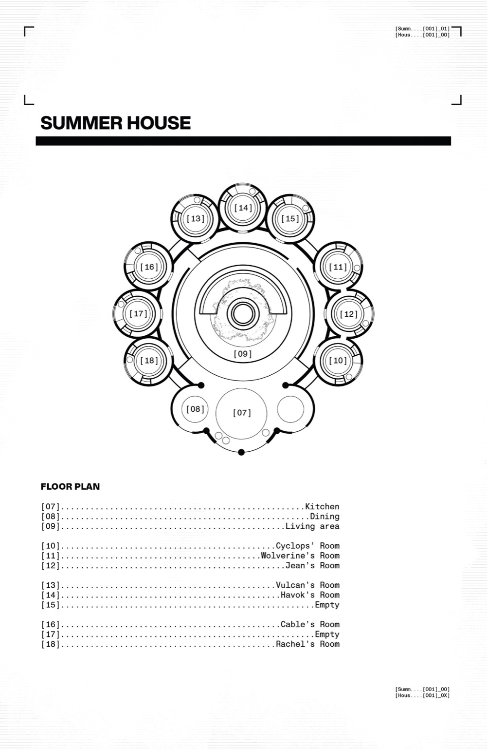 Al termine di questa prima parte il focus si sposterà nella nuova residenza della casata dei Summers ( + alleati), posizionata sulla luna, dove assisteremo a una riunione di famiglia che vede protagonisti anche i membri dello Starjammers di Corsaro, interessante vedere le dinamiche di questa “famiglia allargata” che comprende anche Wolverine e il 3 dei fratelli Summers, Vulcan, protagonisti di un alleggerimento comico decisamente ben riuscito. Nelle solite schede informative alla Hickman anche una planimetria della base, con un particolare interessante riguardante le camere di Jean, Scott e Wolverine, che lascia presagire possibili complicazioni future.