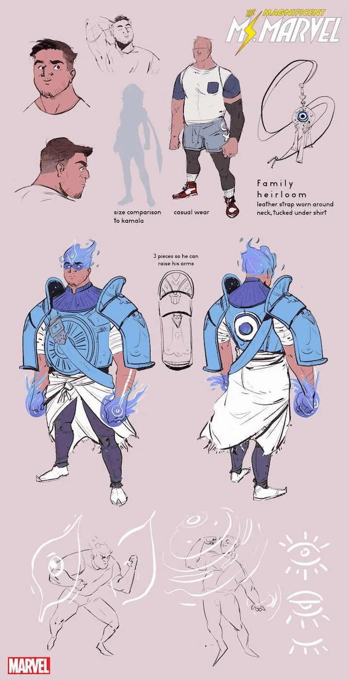 Saladin mi ha lasciato molto libera di divertirmi con questo personaggio. Abbiamo parlato dei suoi poteri di difesa e di come si legano al suo passato di bambino libanese. I colori blu e bianco e il design circolare derivano dal Nazar, un simbolo presente in Medio Oriente, che protegge chi lo indossa dall’occhio maligno, ovvero dai cattivi propositi degli altri. Un piccolo elemento storico e soprannaturale.