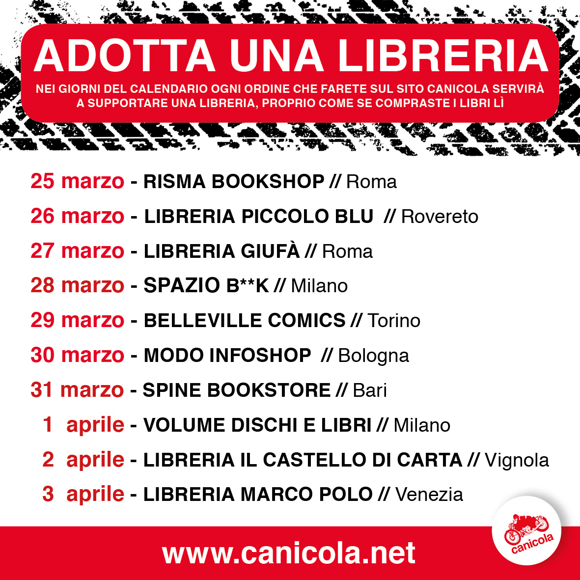 Dal 25 marzo Canicola adotterà una libreria / fumetteria / negozio di dischi + fumetti / libreria per bambini e ragazzi, al giorno nella speranza che anche altre case editrici scelgano di aderire a questa iniziativa e più in generale che tutti insieme possiamo interiorizzare la situazione complessiva.