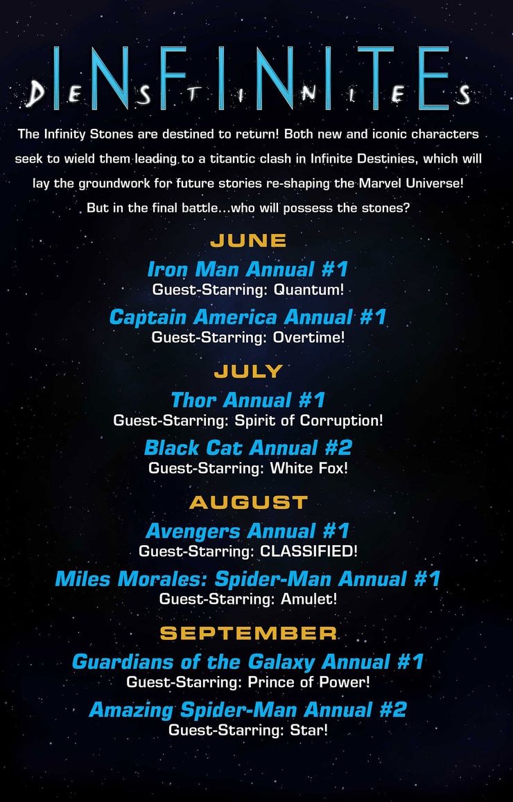 Una serie di 8 annual che presenteranno gli ospiti umani delle gemme abbinandoli a un eroe Marvel, a debuttare sarà Iron Man Annual # 1 dello scrittore Jed MacKay (Black Cat) e dell’artista Ibraim Roberson (Old Man Logan).