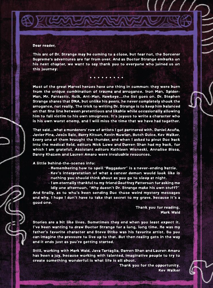 Lo scrittore ha quindi ringraziato gli artisti e i redattori che hanno collaborato con Doctor Strange, tra cui Daniel Acuña, Javier Pina, Jesús Saiz, Barry Kitson, Kevin Nowlan, Butch Guice, Kev Walker, Nick Lowe, Darren Shan, Kathleen Wisneski, Annalize Bissa, Danny Khazem e Lauren Amaro.