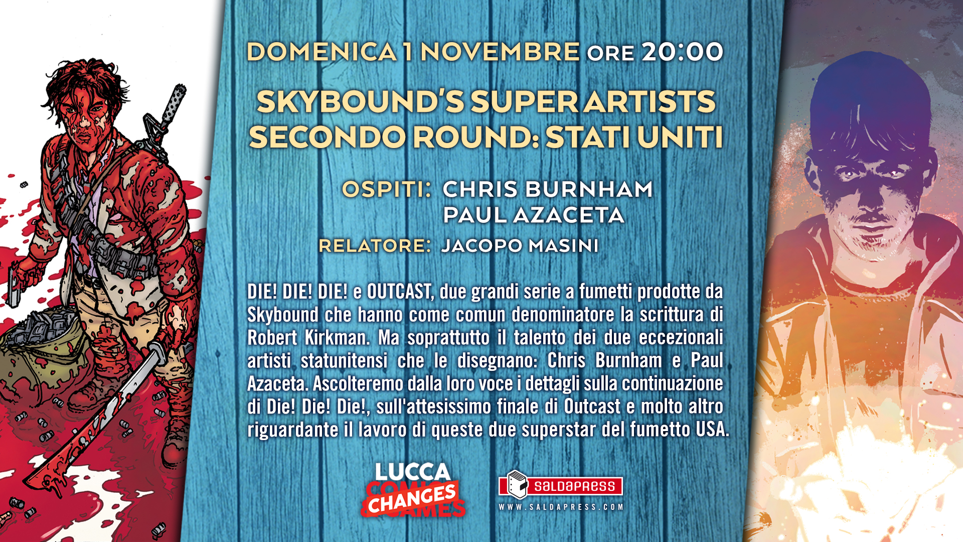 OUTCAST e DIE! DIE! DIE!, due grandi serie a fumetti prodotte da Skybound che hanno come comun denominatore la scrittura di Robert Kirkman. Ma soprattutto il talento dei due eccezionali artisti statunitensi che le disegnano: Chris Burnham e Paul Azaceta. Ascolteremo dalla loro voce i dettagli sulla continuazione di Die! Die! Die!, sull’attesissimo finale di Outcast e molto altro riguardante il lavoro di queste due superstar del fumetto USA. A dialogare con gli autori, Jacopo Masini e Michele Innocenti.