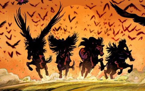 L’illustrazione che fornisce più dettagli sul progetto è quella di quattro figure a cavallo, accompagnate dalla frase “I mostri escono nella notte. Ma la morte cavalca all’alba.”