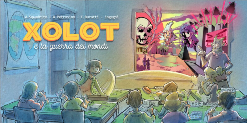 “Xolot e la guerra dei mondi” è una storia nella storia! Quella di Alessandro e dei suoi giovani alunni che, destreggiandosi nei meandri di un corso di fumetto, tra gag divertenti e intoppi narrativi vari hanno ideato e raccontato le sorti di Xolot: un ragazzino costretto a trasformarsi in scheletro immortale per salvare il suo mondo da un’invasione di cyborg provenienti dallo spazio.