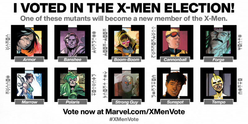 I fan possono scegliere da una lista di 10 nomi che contengono scelte scelte abbastanza varie nel panorama mutante, comprese pedine finite nelle seconde linee ormai da un po’ di tempo come Armor, Cannonball e Sunspot oppure outsider come Tempo, Marrow e Strong Guy