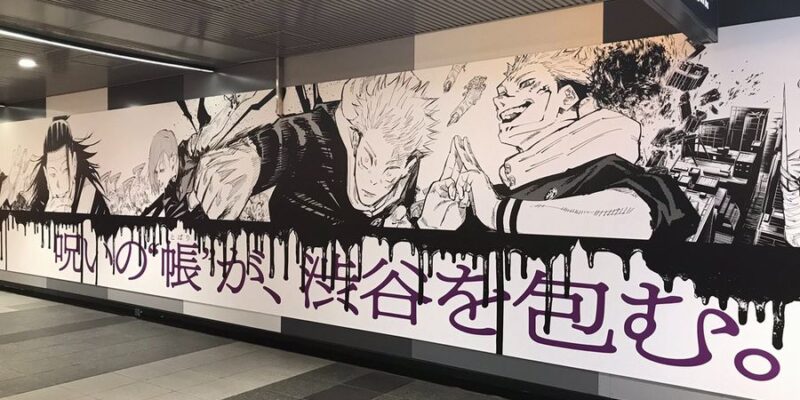 Jujutsu Kaisen, manga di Gege Akutami, ha avuto l’onore di un murales nella stazione di Shibuya, a Tokyo. La serie festeggia l’uscita del quindicesimo tankobon. I giapponesi hanno potuto ammirarlo fino al 14 marzo. La didascalia che accompagnava il disegno era:“Un velo maledetto copre Shibuya”.