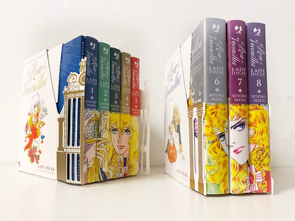 Il primo cofanetto comprendeva l’opera serializzate originariamente su rivista dal 1972 al 1973 raccolta in cinque volumi in grande formato, con tutte le pagine a colori previste in originale e gallery delle illustrazioni uscite originariamente; il tutto raccolto in uno spettacolare box da collezione il cui design riproduce il cancello di Versailles, con all’interno altre splendide sorprese: un esclusivo libretto contenente tutti i frontespizi dell’edizione originale (raccolta inedita) e la Paper doll di Lady Oscar.