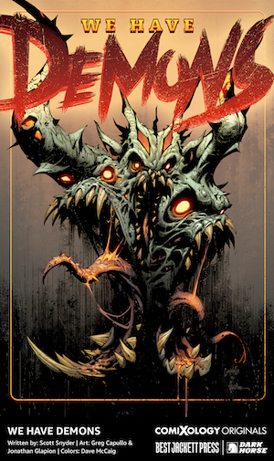 WE HAVE DEMONS written by Scott Snyder with art by Greg Capullo and Jonathan Glapion and colors by Dave McCaig—The conflict between good and evil is about to come to a head when a teenage hero embarks on a journey that unveils a secret society, monsters, and mayhem.