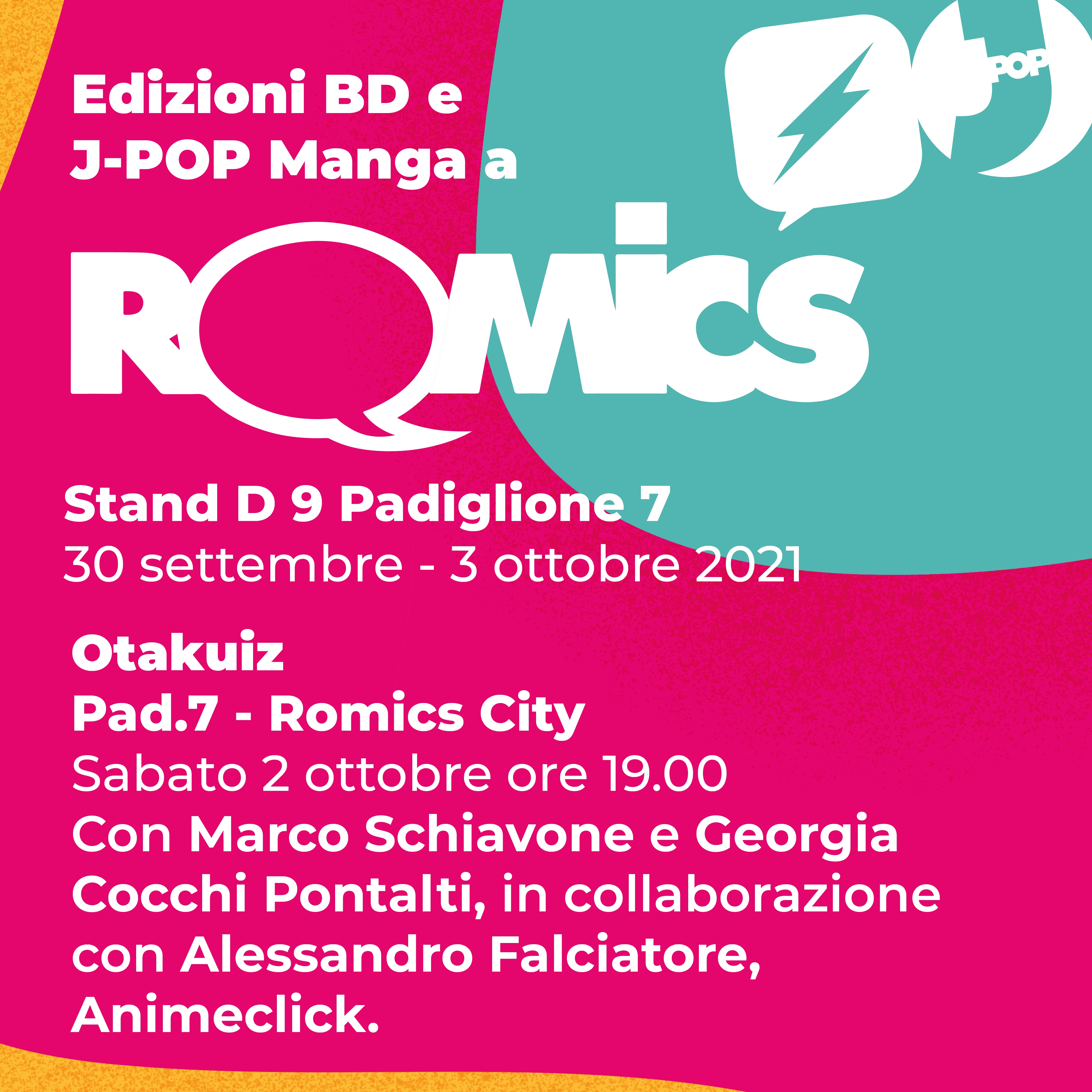 L’evento vedrà la partecipazione di Marco Schiavone, Georgia Cocchi Pontalti e Alessandro Falciatore ma soprattutto dei lettori! J-POP sfida il pubblico con domande su manga e cultura Otaku e mette in palio tantissimi gadget e fumetti! Le preiscrizioni dovranno pervenire allo stand J-POP (Pad. 7, D9) entro le ore 18:00 di sabato 2 ottobre.
