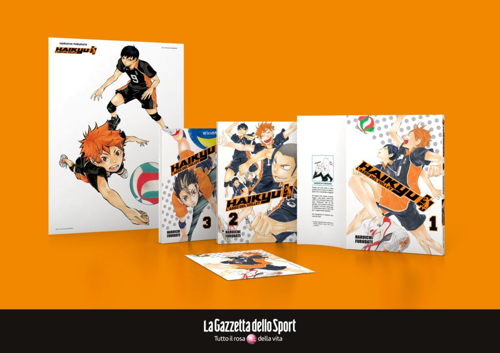 Ogni numero sarà disponibile nel formato speciale 13,7x20cm con alette e conterrà una cartolina con l’immagine di cover. Dal 4 marzo il primo volume sarà in edicola con La Gazzetta dello Sport a 4,99 euro oltre al prezzo del quotidiano. In regalo con il primo numero il poster di Hinata e Kageyama. I successivi fumetti saranno disponibili ogni venerdì in edicola sempre al costo di 4,99 euro oltre al prezzo del quotidiano.