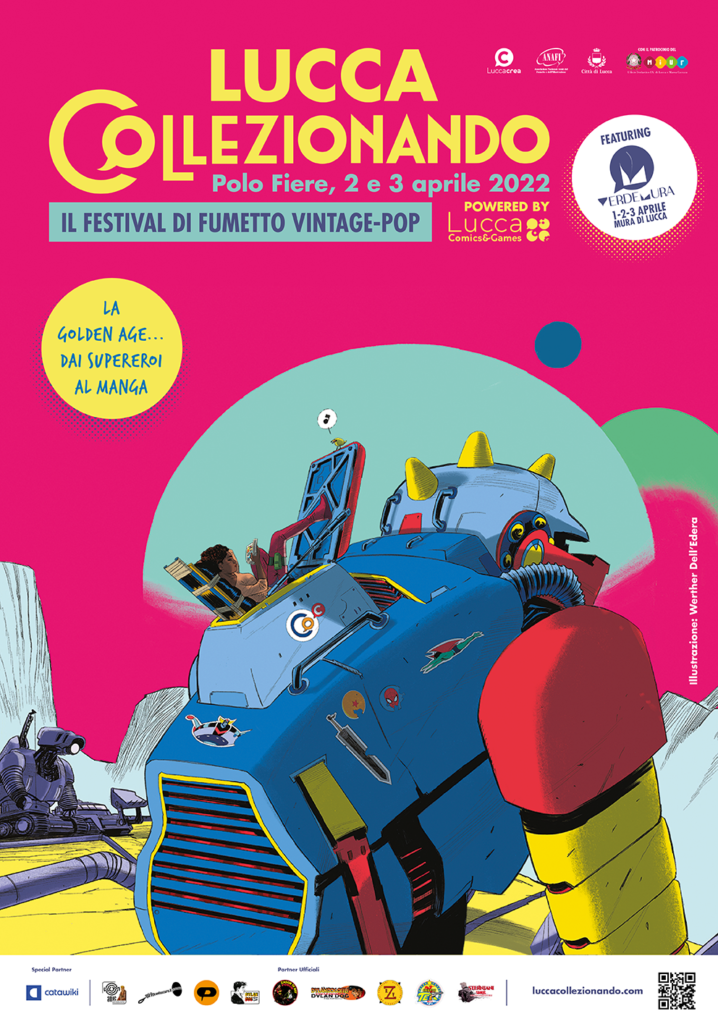 Il Poster 2022 è firmato da un artista d’eccezione come Werther Dell’Edera, già vincitore agli Eisner Award e ai Lucca Comics Award con Something is killing the children (Edizioni BD). L’autore ci riporta alle atmosfere dei fumetti anni ‘60 e ai colori di Jack Kirby, dove una futuristica lettrice gode della lettura a bordo di un robot dal sapore nipponico.