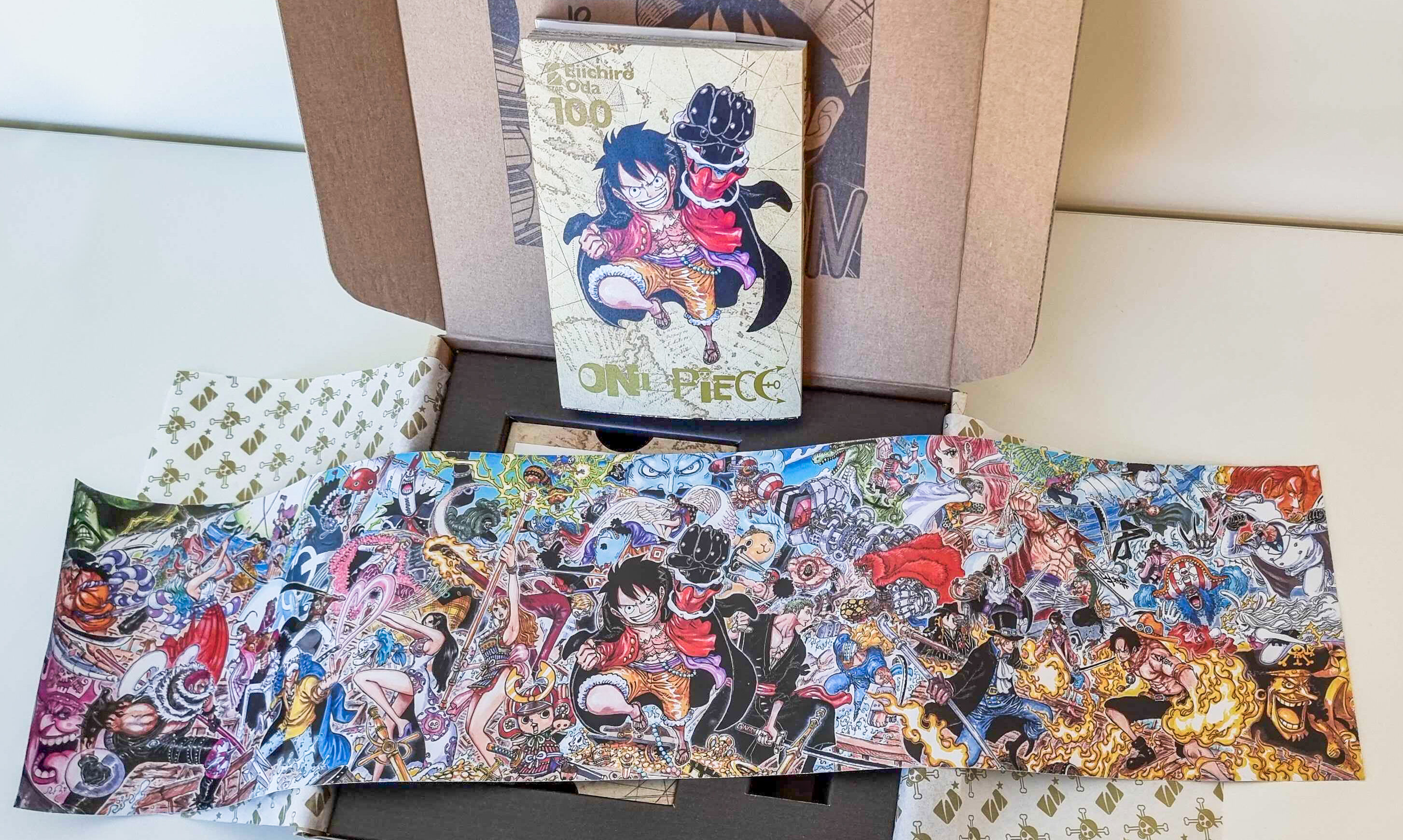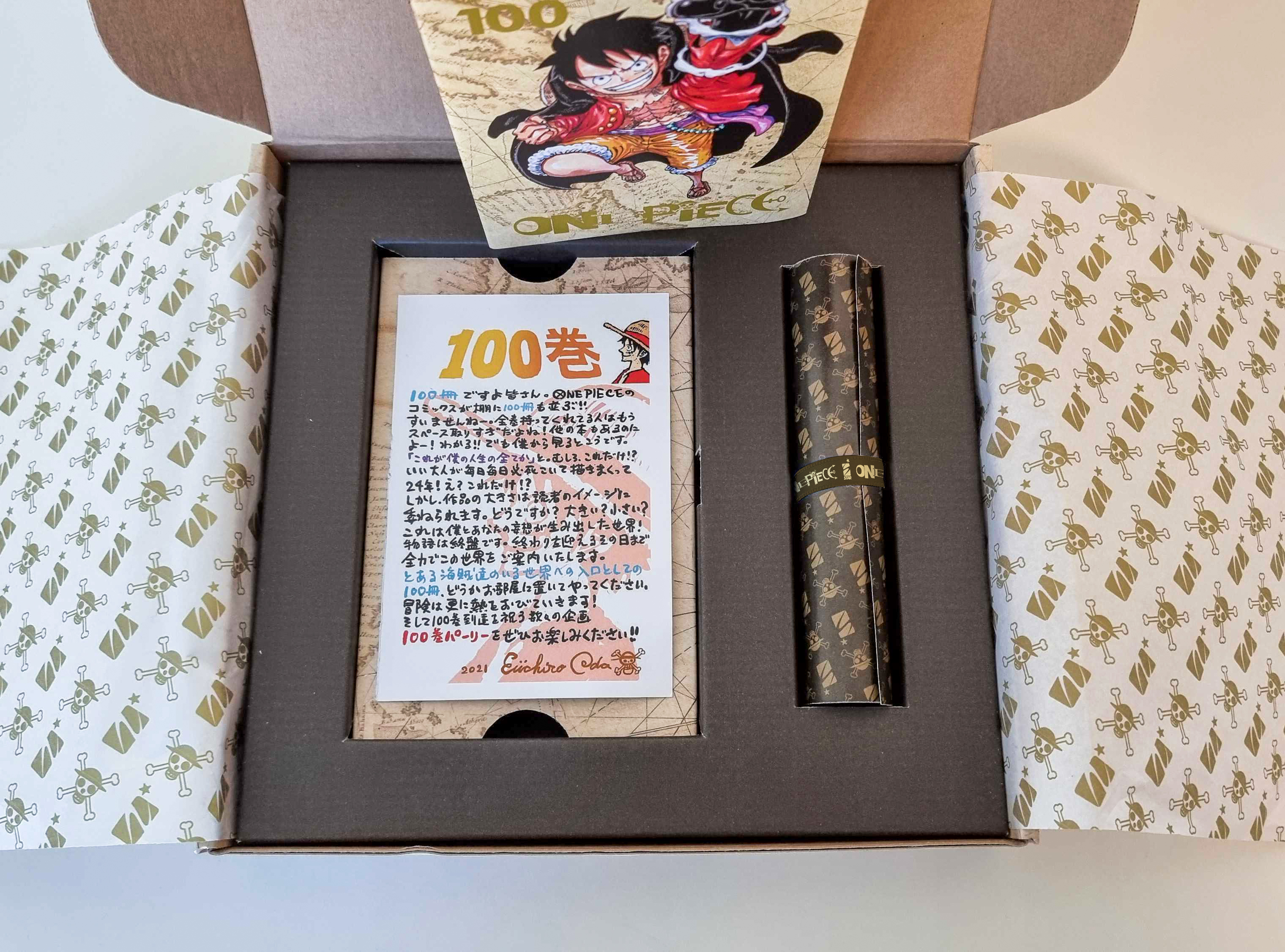 Per celebrare l’attesissima tripla cifra, l’editore della stella presenterà il volume – in arrivo il 20 aprile 2022 – in un cofanetto speciale progettato dal designer Fabrizio Verrocchi. Il box, in tiratura limitata, sarà arricchito esternamente da una stampa in lamina dorata e da un doblone in rilievo sul coperchio. All’interno del box, oltre al volume numero 100 nella speciale Celebration Edition dotata di sovraccoperta in PVC trasparente, ci sarà spazio per inserire anche le edizioni celebrative dei volumi 98 e 99 (non inclusi nel box). Il volume sarà accompagnato da una particolarissima “pergamena”: un esclusivo e lunghissimo poster a colori da srotolare che raffigura tutti, ma proprio tutti, i personaggi più importanti della storia, sigillato da un originale bracciale in tessuto personalizzato ONE PIECE e Star Comics. Infine, all’interno della box sarà presente un messaggio del maestro Eiichiro Oda per ringraziare e omaggiare i suoi milioni di lettori.