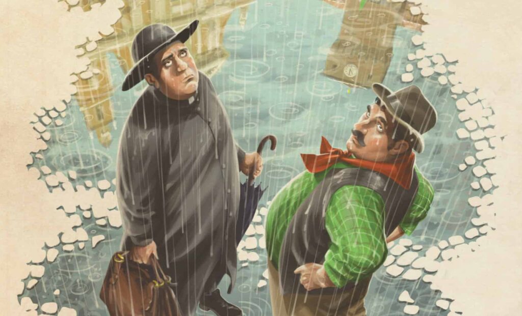 Ritroverete scene celebri come l’esilio del parroco in montagna, l’alluvione del Borgo e il ritorno in paese dell’ex fascista travestito da indiano, raccontate a partire dall’adattamento dei racconti originali. Si tratta di episodi separati – alcuni già pubblicati sulla collana Don Camillo a fumetti, altri inediti – che, come nel film, sono “cuciti insieme” da scene di raccordo scritte ad hoc, tenendo sempre sott’occhio la sceneggiatura originale.