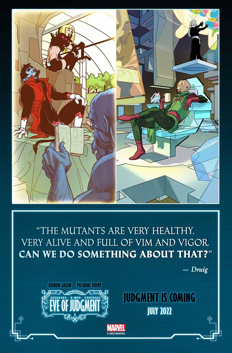 Il mese prossimo, Krakoa si prepara alla guerra quando il genere mutante viene preso di mira dagli Eterni! I Vendicatori hanno una possibilità di impedire che un conflitto apocalittico scoppi nell’Universo Marvel? Scoprilo in AXE: JUDGMENT DAY, l’ultimo evento crossover Marvel Comics in arrivo negli USA quest’estate. Scritta da Kieron Gillen e disegnata da Valerio Schiti, l’epica saga regalerà elettrizzanti collegamenti ai recenti eventi dei titoli AVENGERS, X-MEN ed ETERNALS. I fan americani hanno avuto il loro primo assaggio nel FREE COMIC BOOK DAY: JUDGMENT DAY di quest’anno e potranno intuire l’intera portata del piano distruttivo degli Eterni in AXE: EVE OF JUDGMENT, un numero speciale di preludio di Gillen e Pasqual Ferry.