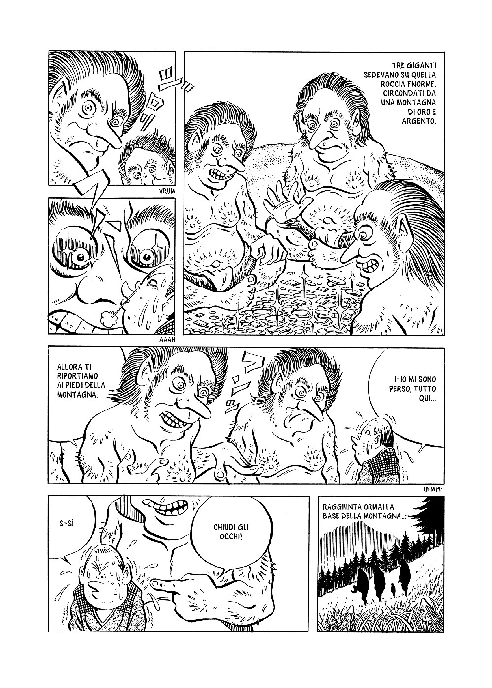 Tono Monogatari è composto da tanti racconti che scorrono rapidissimi, parlando di uomini delle montagne che rapiscono donne, di kappa, Yokai, di spiriti e altre creature, ma anche di uomini e donne sole e tristi, di miti che incontrano e si mescolano di episodi storici, insomma il panorama è decisamente vario. Esteticamente Mizuki utilizza uno stile minimale e semplice, quasi caricaturale, per disegnare i suoi protagonisti, lasciando lo stile più realistico per ciò che è inanimato, un mix che funziona e soddisfa l’occhio del lettore.