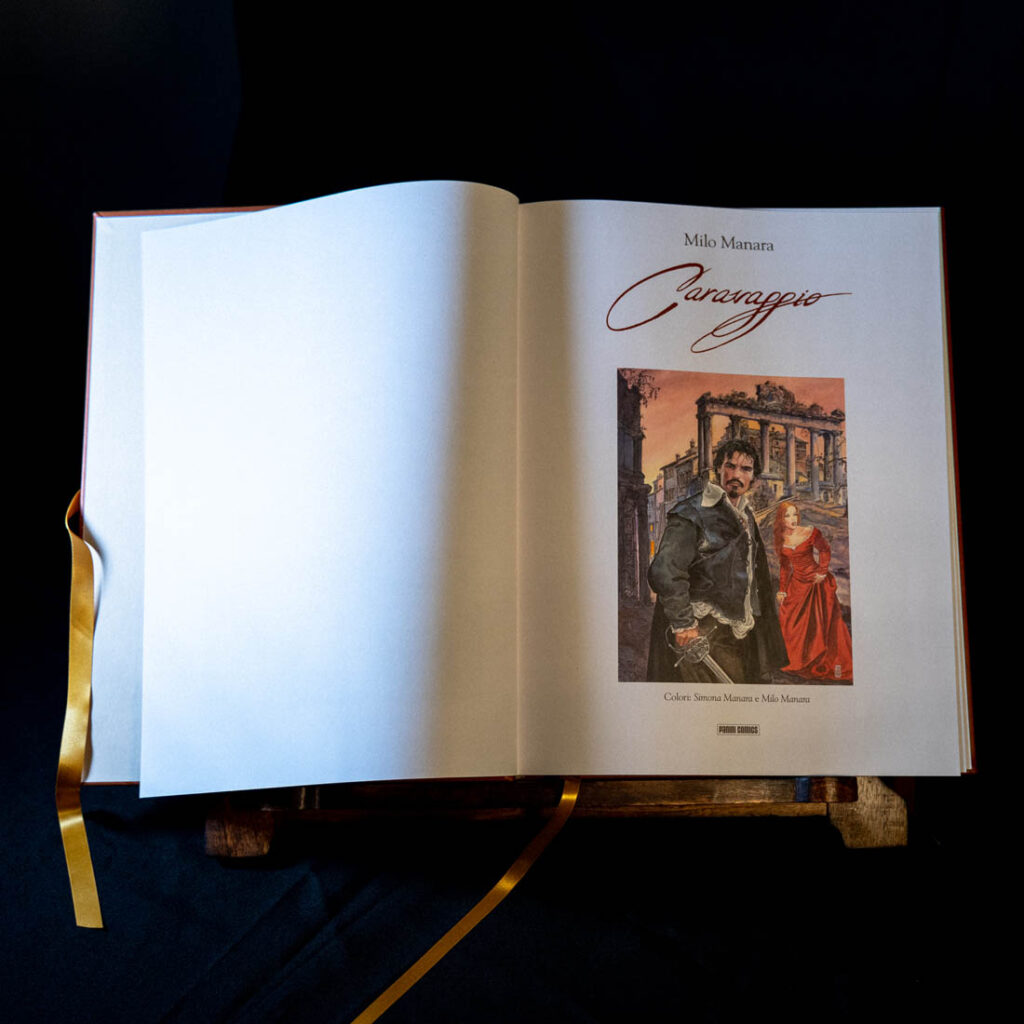 Milo Manara’s Caravaggio – Exclusive Edition è accompagnata da un elegante leggio di legno che permette l’esposizione delle tavole di grande formato come vere e proprie opere d’arte. Le sorprese della nuova edizione sono numerose: dalla copertina termovirante con stampa in foil oro, laccetti dorati di chiusura e fettuccia-segnalibro dorata, alla postfazione inedita ed esclusiva della storica dell’arte Rossella Vodret. Il volume contiene inoltre una rubrica-tour virtuale che illustra la collocazione dei quadri raffigurati nella graphic novel e una cover gallery con le copertine dei volumi precedenti.