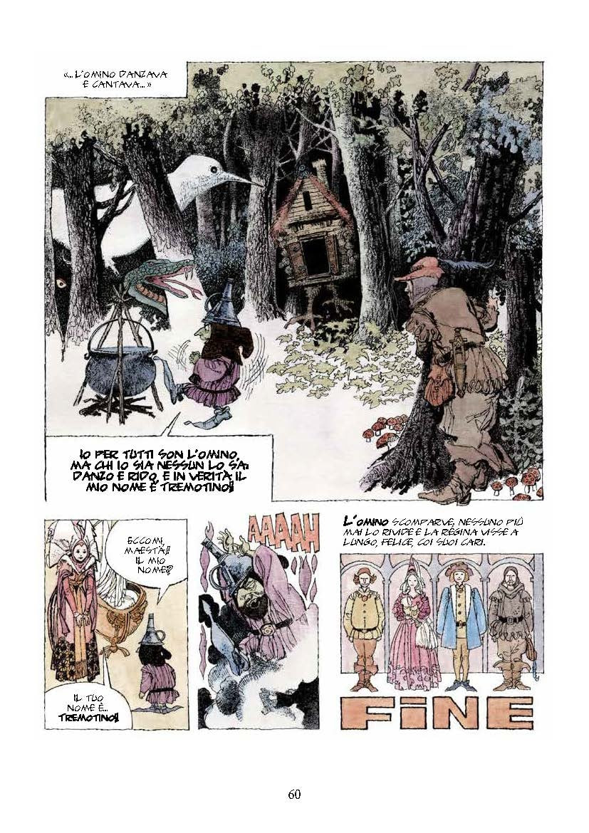 Le tinte cupe e gotiche tipiche dell’autore, si uniscono ad atmosfere trasognanti ed evocative, in un’operazione che va oltre la mera sintesi e trasposizione e sfocia in nuove caratterizzazioni delle narrazioni. Da questo incredibile lavoro dell’artista veneziano, emerge con forza la sua cultura fumettistica e il suo intelligente uso del sistema linguistico della vignetta. Le scelte di adattamento, poi, si dimostrano rivoluzionarie: la famosa Cenerentola dei fratelli Grimm diventa “Ceneraccio”, declinata al maschile, offrendo una visione alternativa ma non parodica; e ne L’usignolo dell’imperatore di Andersen si aggiungono tre personaggi della commedia dell’arte italiana, Arlecchino, Balanzone e Tartaglia. Una raffinata operazione di rielaborazione di storie, fiabe, racconti che conferisce un nuovo carattere agli stessi senza tradirne gli intenti originari.
