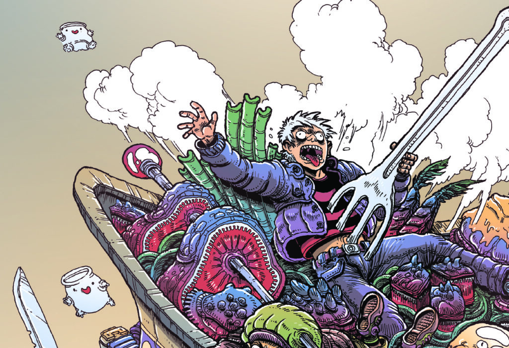 Stokoe in quest’opera – una delle sue prime – lascia fluire tutta la sua follia, realizzando un’opera che mescola all’interno di una pentola sci-fi, un mix di viaggi spaziali, strane ricette culinarie e mazzate incredibili