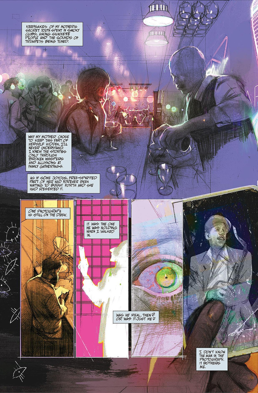 Mentre si legge questo graphic novel si ha perennemente la sensazione di essere circondati dalla musica, da note jazz che si formano all’interno della nostra mente in maniera autonoma riempiendo il silenzio delle tavole dove vediamo Erik – il protagonista – suonare il suo strumento. Ram V scrive un testo che come note lascia anche le sensazioni in sospensione, ci fa sentire il peso dei suoi rimorsi, dei suoi ricordi, della sua ossessione, la malinconia. Tutto questo ci permette una maggiore immersione nella storia e soprattutto nella mente di Erik, in quello che prova mentre tutto attorno a lui cambia vertiginosamente e in maniera quasi imprevedibile .