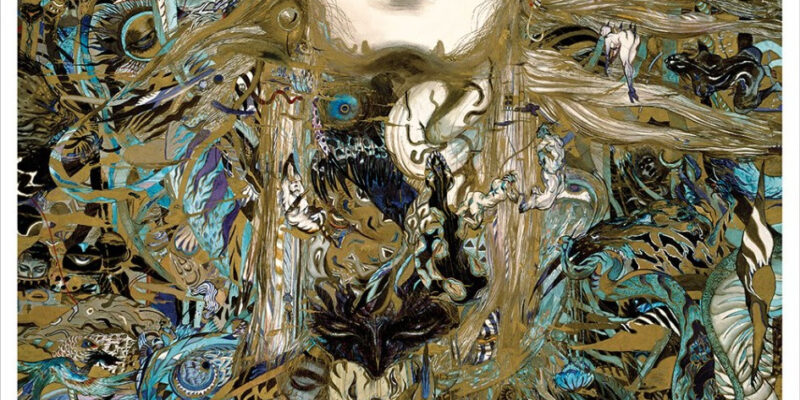 L’opera di Amano, dal forte impatto visivo ed emotivo, è una sintesi della sua poetica: spiritualità orientale, estetica fantasy e pittura senza tempo. Un volto fluttuante, avvolto da linee dorate e forme eteree, invita lo spettatore alla trascendenza e alla connessione tra mondi visibili e invisibili.