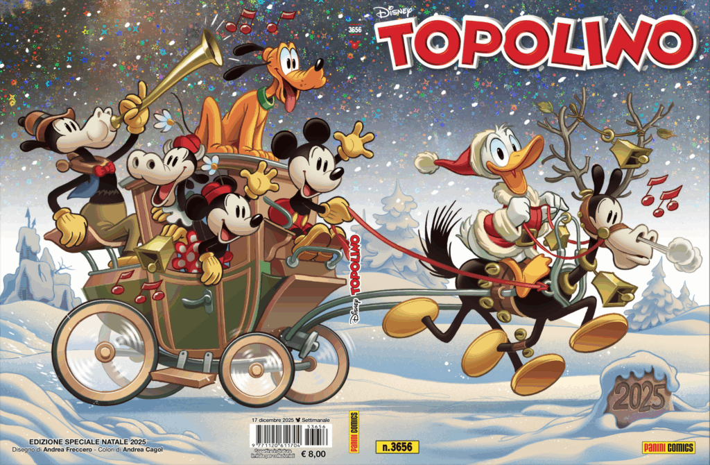 La magia delle feste sta per invadere le nostre fumetterie! Panini Comics ha annunciato l’uscita del numero speciale di Topolino per Natale, il 3656, disponibile da mercoledì 17 dicembre in edicola, fumetteria e su Panini.it. Preparatevi a un’edizione ricca di sorprese, con un ospite d’eccezione e una cover da collezione che farà la gioia di tutti i fan Disney.